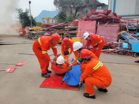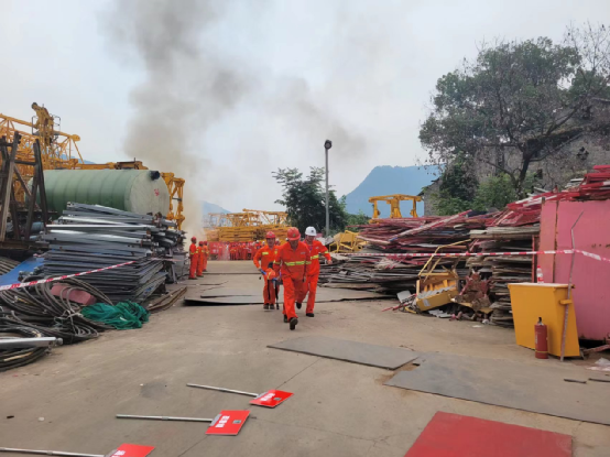 伴隨著緊急警報聲響起,演練正式開始。本次演練活動由西部區(qū)域運營總監(jiān)羅建擔(dān)任總指揮,四川分公司經(jīng)理楊春強擔(dān)任副總指揮,施工現(xiàn)場濃煙四起,通訊組馬上向副總指揮報告施工現(xiàn)場起火,副總指揮向總指揮上報現(xiàn)場情況,總指揮馬上下達啟動應(yīng)急預(yù)案機制;疏散組已將現(xiàn)場拉起警戒線,同時現(xiàn)場群眾在安全員的指揮下迅速按消防預(yù)案的疏散線路有序拿起濕毛巾或消防防毒防煙面罩,小步快走,迅速且有序撤離現(xiàn)場。同時現(xiàn)場傷員通過心肺復(fù)蘇等方法也得到緊急救治并交給120;火情也在大家的共同努力下被有效控制。